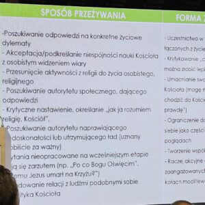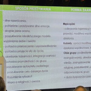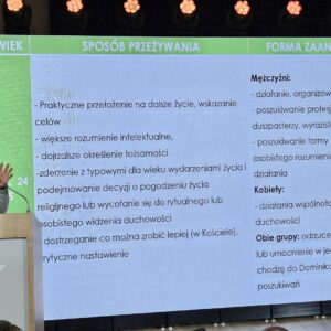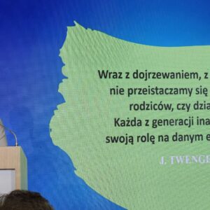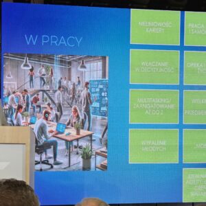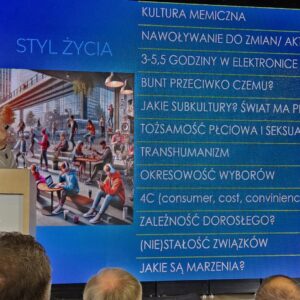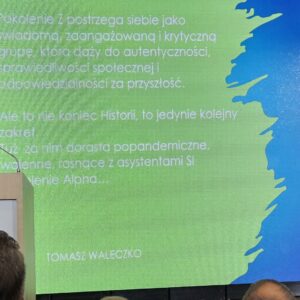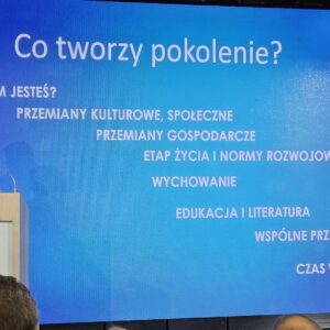 Pan Tomasz przedstawiał kolejne cechy dzisiejszych młodych i młodych dorosłych: chcą autentyczności i szczerości, ubiorem pokazują siebie, przez kontakt z całym światem mają globalną perspektywę życia, krytyczny stosunek do instytucji, wykazują troskę o środowisko i istoty nieludzkie, np zwierzęta, nie akceptują kultury przymusu, cechuje ich elastyczność zawodowa i chęć pracy zdalnej, ważna jest dla nich samorealizacja i elastyczna edukacja, przywiązują znaczenie do zdrowia psychicznego i emocjonalnego, wykazują zaangażowanie społeczne i polityczne, są za równością i inkluzywnością, żyją w świecie nowoczesnych technologii i przywiązują ogromną wagę do swojej cyfrowej tożsamości czyli kto, co o nich mówi w sieci.